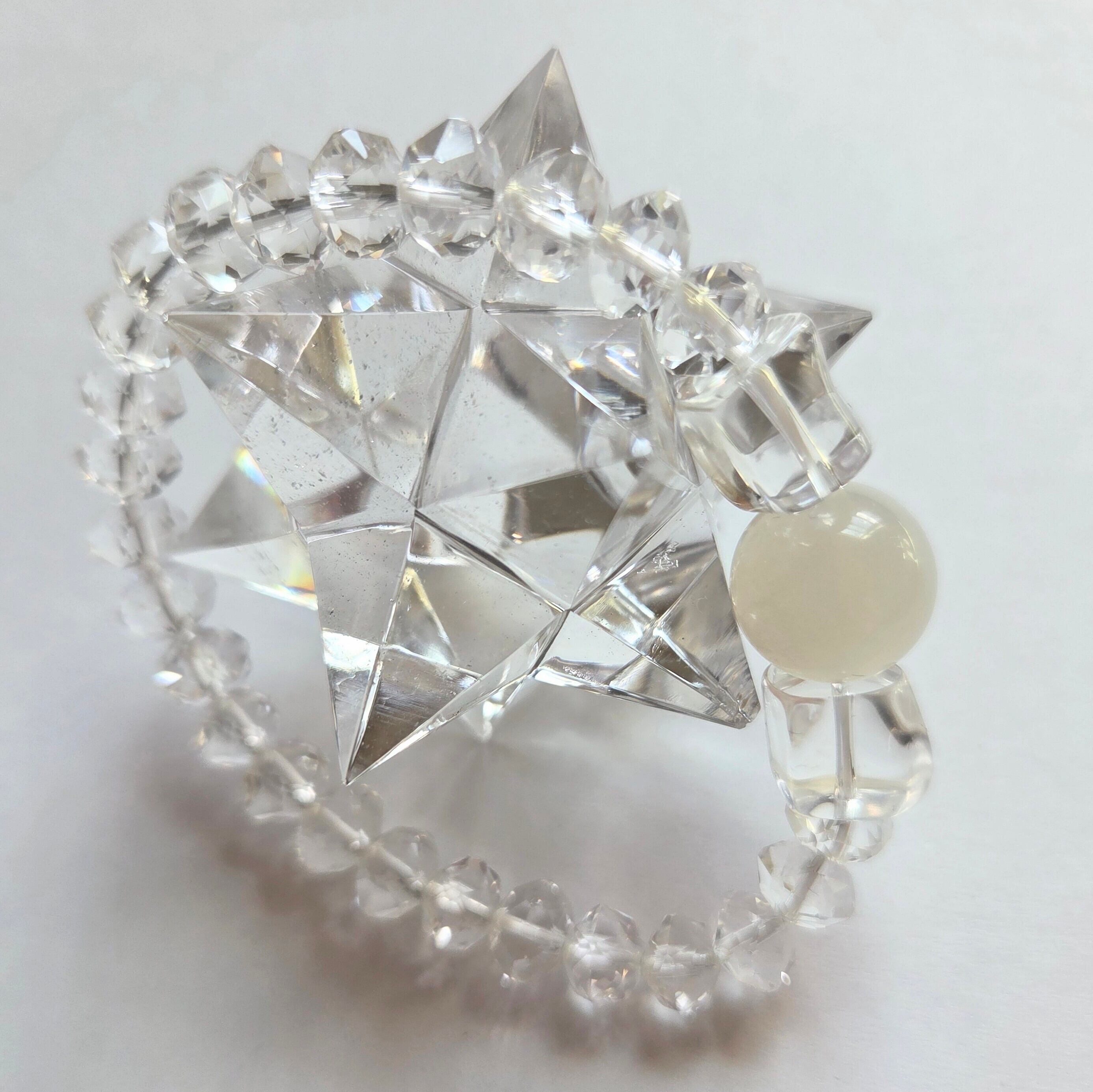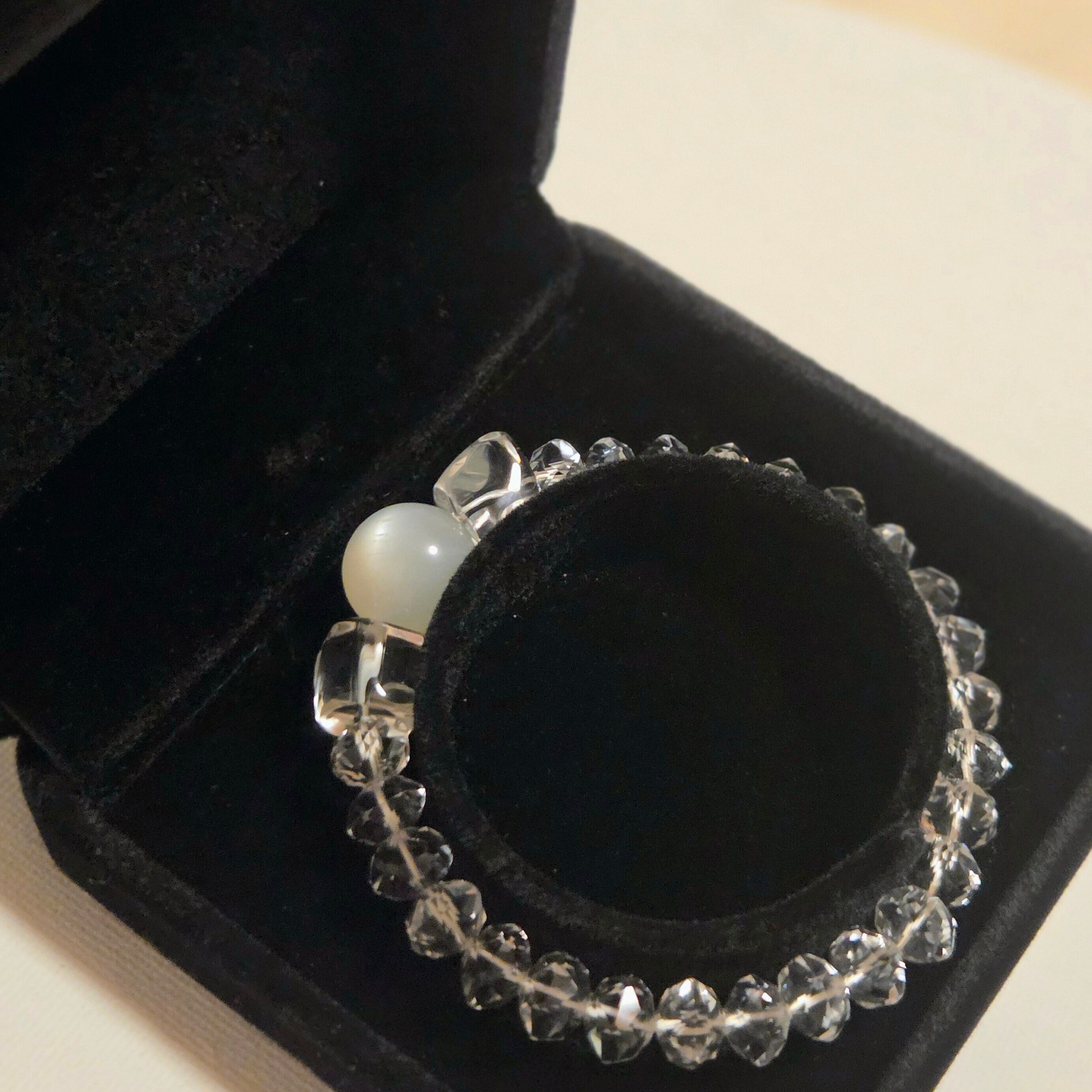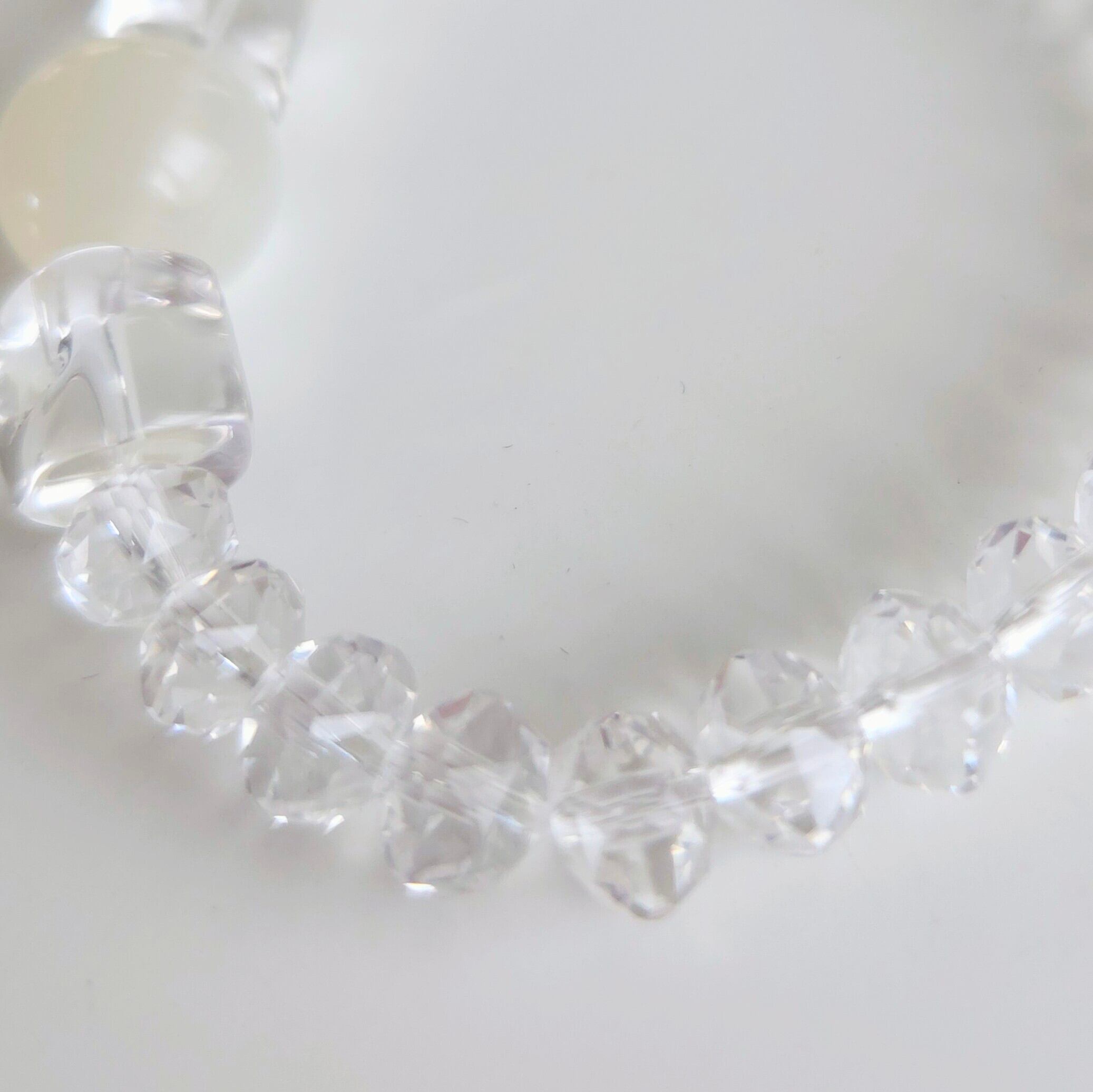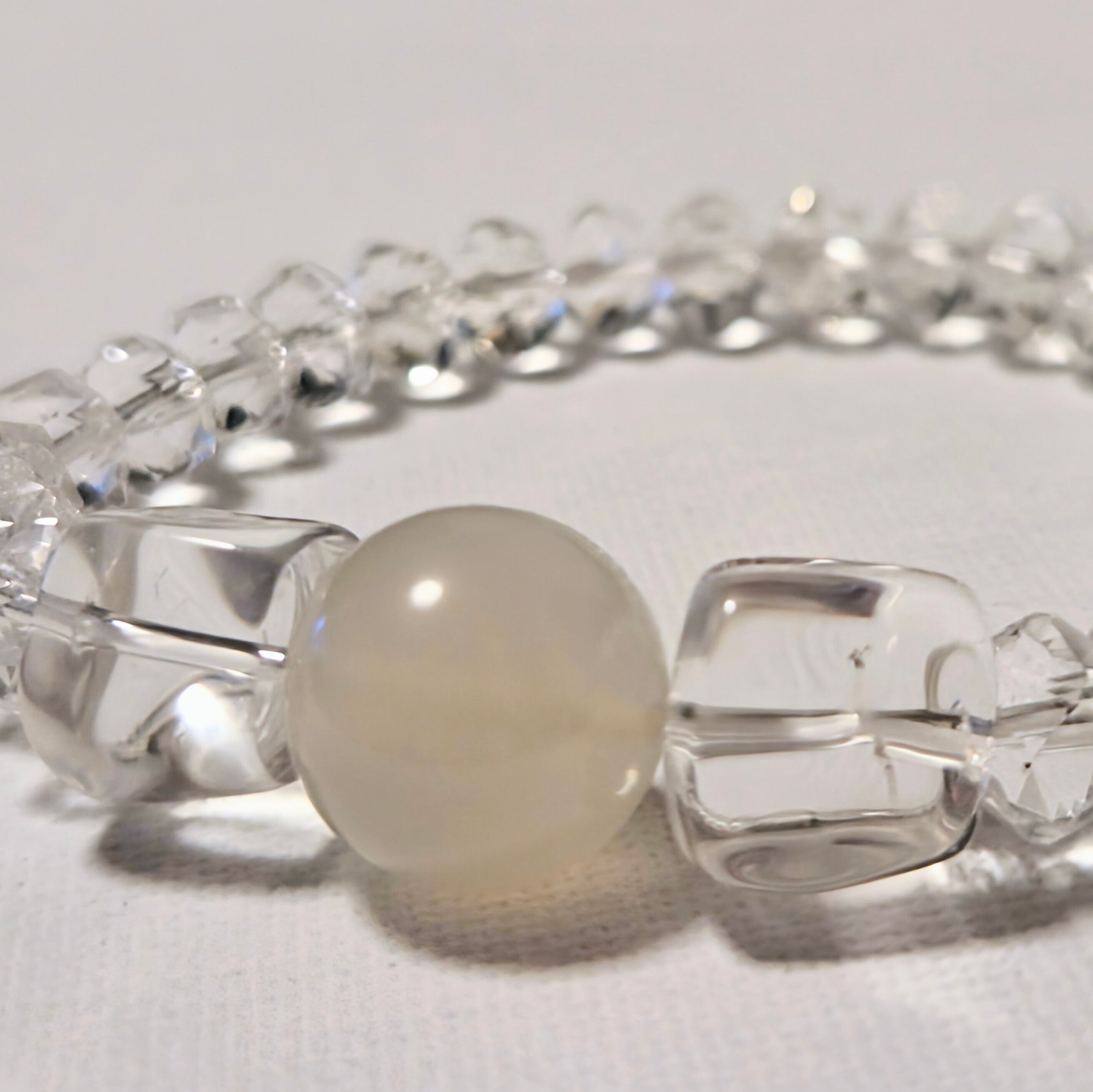 このパワーブレスは、あなたの日常に特別なエネルギーをプラスする魅力的なアイテムです。水晶の清涼感ある色合いと浄化ムーンストーンの女性的な優しさが思考や感情をクリアにし、穏やかさをもたらします。水晶のキラキラなカットがエネルギーを倍増させます。