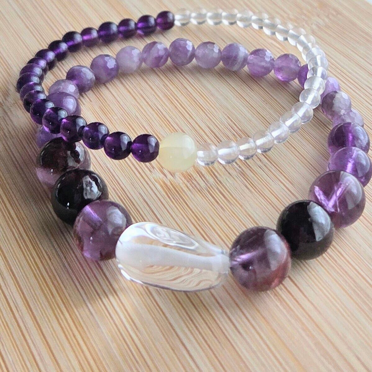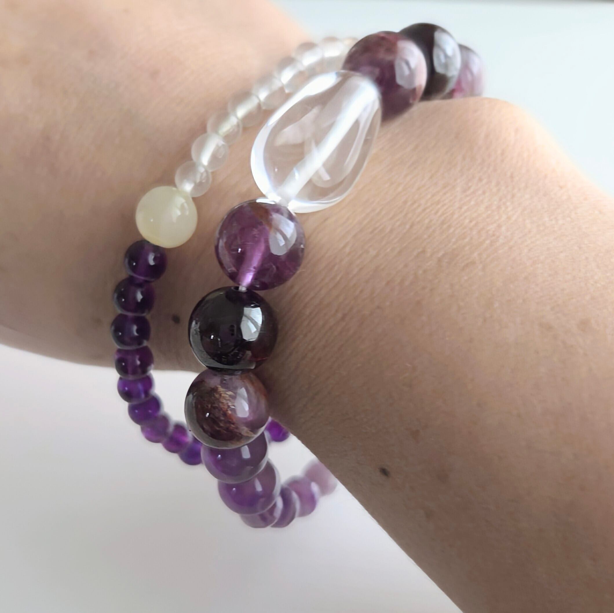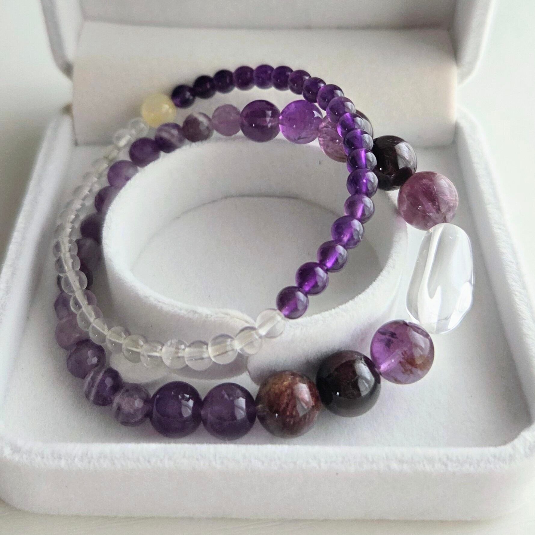 水晶とアメジスト、カコクセナイトが浄化と癒しのパワーをガーネットはグランディング、カルセドニー癒しとあなたをサポートいたします。
